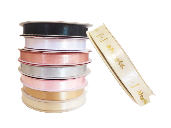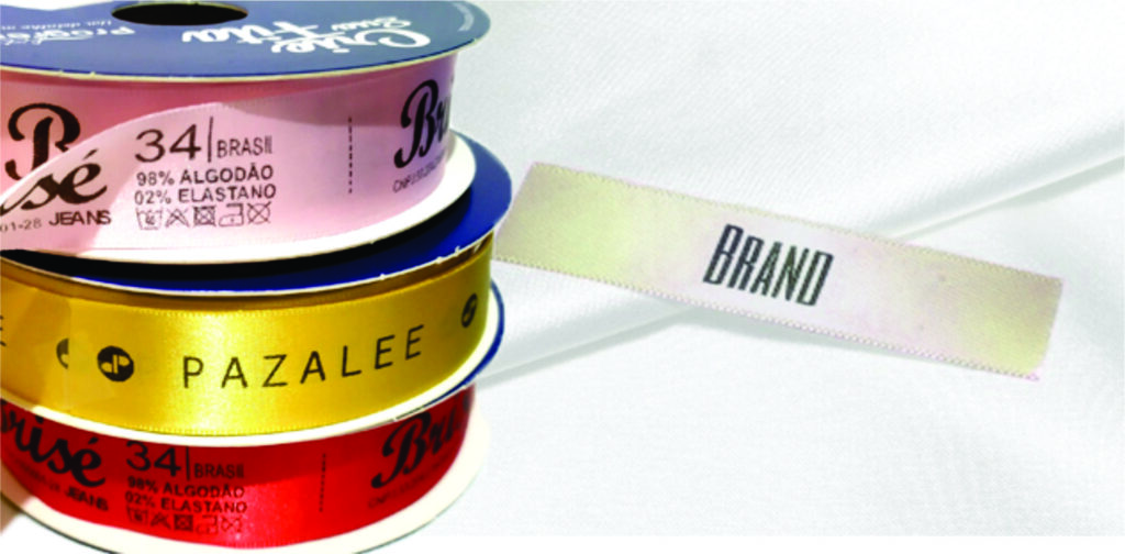 Etiqueta personalizada impressa em cor única em rolo de cetim. Adequada para vestuário, com marcação para corte e personalização em preto, dourado ou prata.